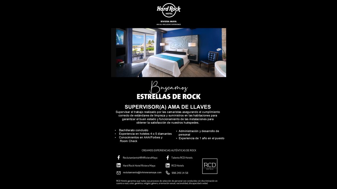 HARD ROCK HOTEL RIVIERA MAYA te invita a formar parte de la banda como SUPERVISOR AMA DE LLAVES